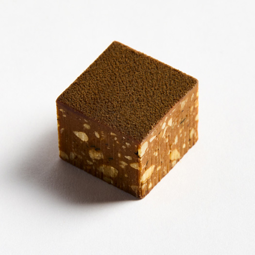 ピエール自身が有明海を訪れ、和食材の海苔とチョコレートの相性を見極め、誕生した“潮騒”。ヘーゼルナッツと佐賀県産の有明海苔を加えたヘーゼルナッツプラリネは、素材の調和が際立つ。