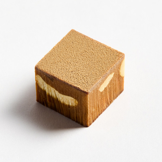 燻製カシューナッツプラリネに、爽やかな甘みの高知県産ユズピールとカシューナッツの食感がアクセント。スモーキーなアロマを堪能する一粒。