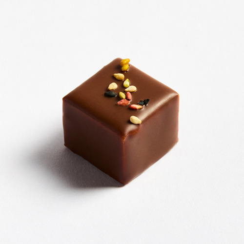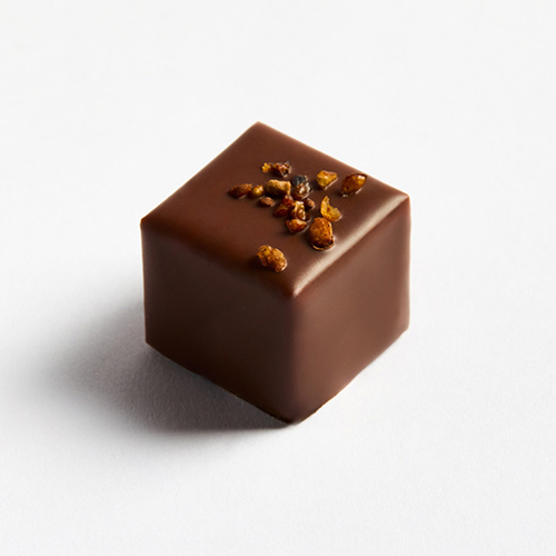 ヘーゼルナッツと佐賀県産有明海苔を加えたヘーゼルナッツプラリネ。素材の調和が際立つ一粒。