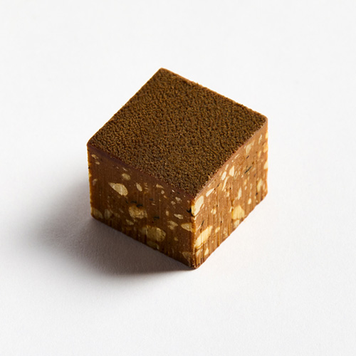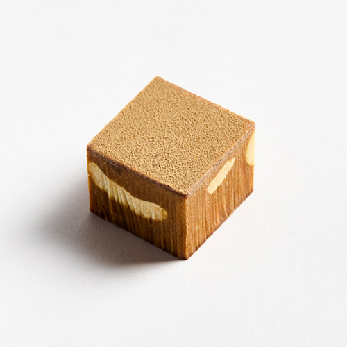 ほうじ茶ガナッシュと燻製カシューナッツプラリネをビターチョコレートでコーティング。日本茶の静謐な洗練さを表現した一粒。