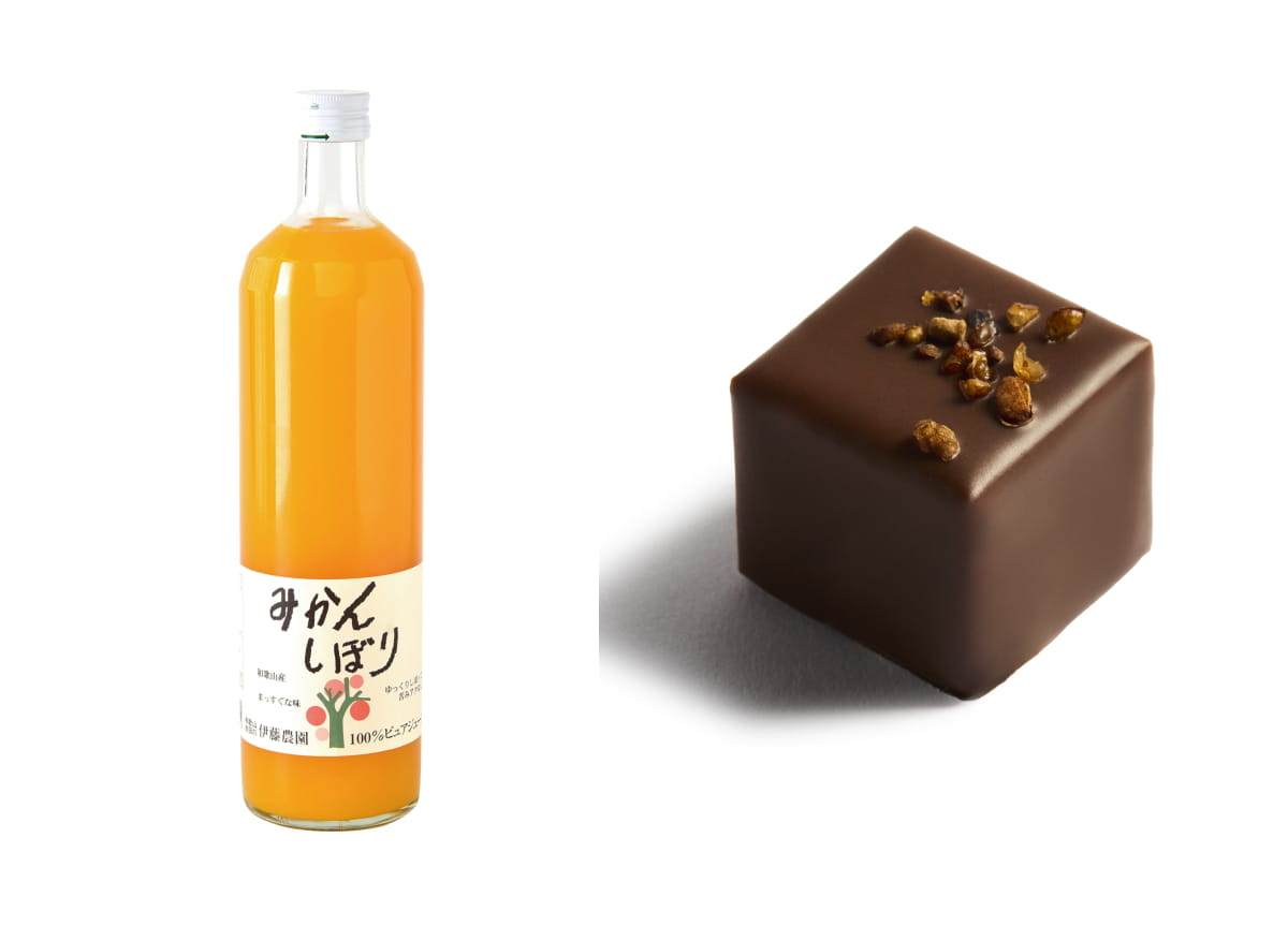 和歌山県有田の代表銘柄「温州みかん」を使用した100%ピュアジュース。温州みかんは採取時期によって「極早生(ごくわせ)」、「早生(わせ)」、「中生(なかて)」、「晩生(おくて)」の4種に分けられます。「100%ピュアジュース みかんしぼり」では、甘さが増してくる「早生」の完熟を原料として使用しており、強い甘さとコク、豊かな香りを楽しめるジュースに仕上がっています。 “涼風の記憶”では徳島県 阪東食品様のスダチと合わせて、ミカンの甘みとスダチの酸味、柑橘の豊かな香りが楽しめるガナッシュに仕立てています。