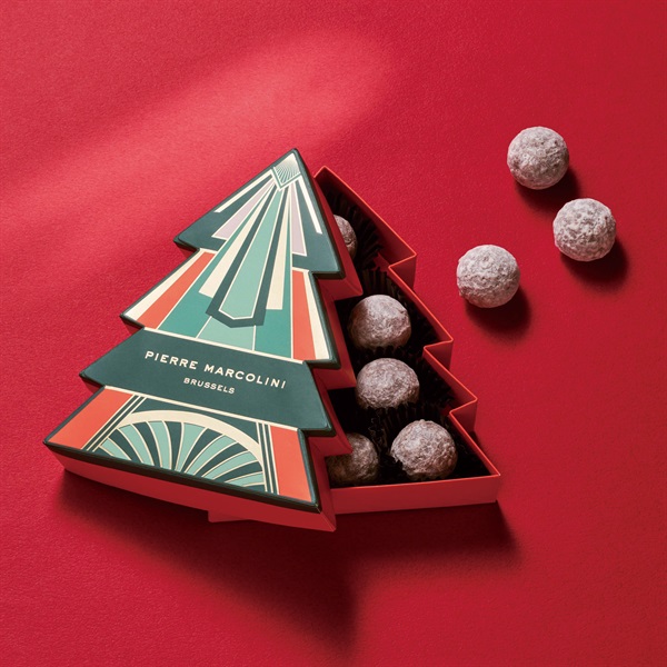 ビターチョコレートの中にマール ドゥ シャンパーニュで⾹り付けした滑らかなガナッシュを詰め、⽩いパウダーシュガーを纏わせたトリュフシャンパーニュをクリスマスツリーを象ったパッケージに詰め合わせました。