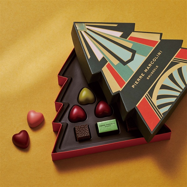 ピエール マルコリーニの⼈気のチョコレートをクリスマスツリーを象ったパッケージに詰め合わせました。
