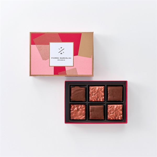 バニラをふんだんに使用したギモーヴをビターチョコレートでコーティングした「ギモーヴ ヴァニーユ」と「ギモーヴ ピスターシュ」の詰め合わせ。