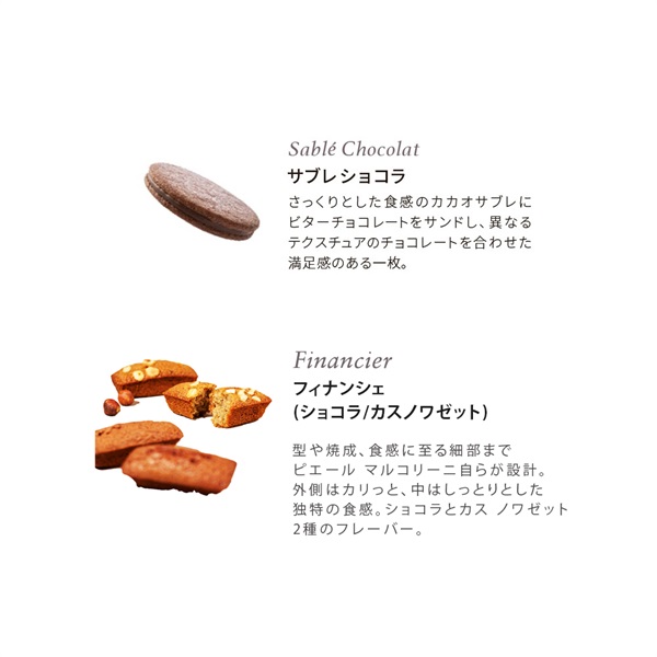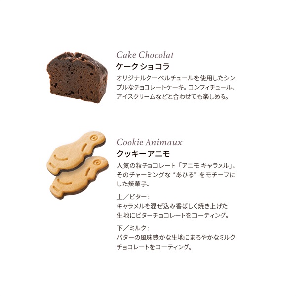 | 内容 | ・ケーク ショコラ×1 ・サブレ ショコラ×1 ・クッキーアニモビターx 1 ・クッキーアニモミルクx 1 ・フィナンシェ オ ショコラ x 2 ・フィナンシェ カス ノワゼット x 2 |