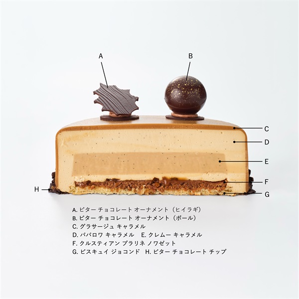 くちどけ滑らかなババロワキャラメルと、濃厚なクレムーキャラメルを重ねて仕⽴てた、クリスマス限定のキャラメルケーキ。