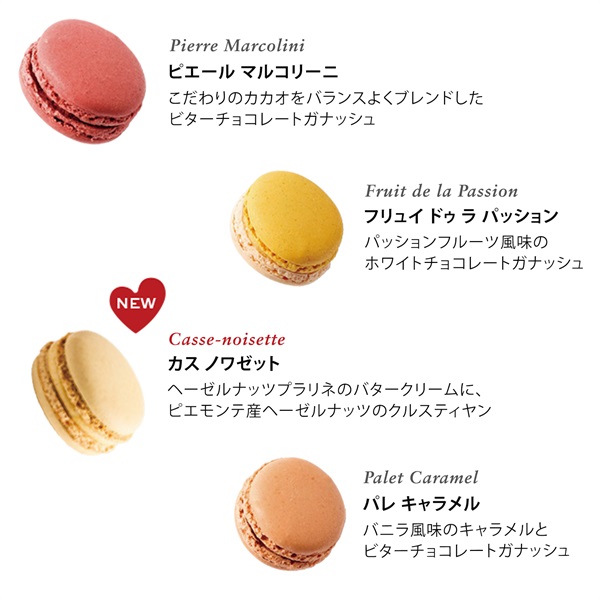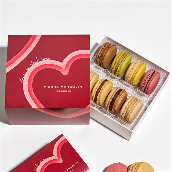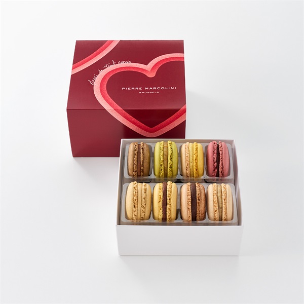 ヨーロッパの伝統菓子に、ピエール マルコリーニのセンスとこだわりを掛け合わせて完成されたマカロンを、今年のホワイトデーコレクションのテーマ「Merci de tout Coeur」のモチーフが施されたパッケージに詰め合わせました。サクサクした生地の歯応え、滑らかなガナッシュやクリームの風味をお楽しみください。